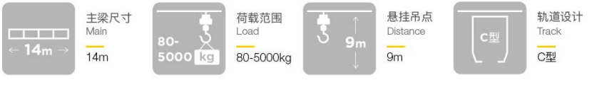 • 起重量可達(dá)2000kg,多種軌道型號(hào)和跨度;