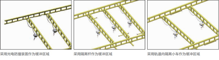 當(dāng)需要有多個操作人員在同一區(qū)域同時工作時,可以采用多主梁起重機。我們通常可以采用多種形式的緩沖區(qū)域防止起重機主梁之間相互干涉。通過這種方式也可以實現(xiàn)用小規(guī)格的型軌承載多個主梁。比如,用500公斤承載能力的型軌可以同時承載兩組500公斤承載的主梁。當(dāng)然,為了防止型軌上的負(fù)載超載,我們需要采用緩沖區(qū)域保持主梁之間的間距。